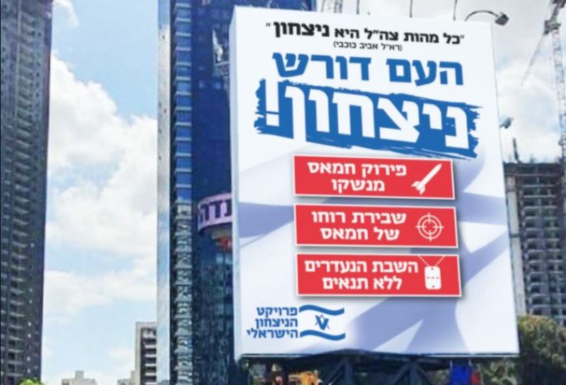 «Народ требует победы!» - билборды с такой надписью появились на шоссе Аялон в Тель-Авиве и в других оживленных местах страны. Так началась общественная кампания граждан, разочарованных результатами операцией «Страж стен». Ее координирует проект «Победа Израиля» центра «Ближневосточный форум» - авторитетной организации, объединяющей исследователей, экспертов, политических и общественных деятелей США, Израиля и других стран Ближнего Востока.