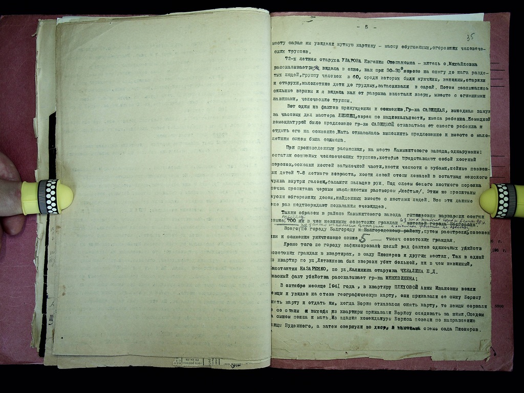 «При проведении раскопок на месте Камышитового завода обнаружены останки сожженных человеческих трупов, которые представляли собой костный порошок, осколки костей затылочной части, кости челюсти с зубами, шейные позвонки детей 7-8-летнего возраста, кости левой стопы, лежащей в остатках женского чулка внутри галоши, фаланги пальцев рук. Под слоем белого костного порошка почва пропитана черным маслянистым раствором (нефтью). Этим же пропитаны куски обгоревших досок, найденных вместе с костями людей. Таким образом, в районе Камышитового завода гитлеровцы варварски сожгли свыше 1700 ни в чем не повинных советских граждан, из них жителей Белгорода 90 человек, а остальные фамилии неизвестны».