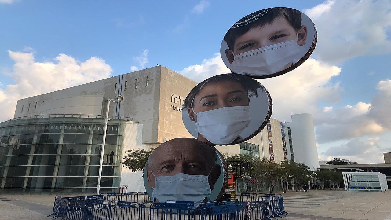 Знаменитая скульптура Менаше Кадишмана на площади Габима одела защитные маски. Таким путем мэрия города вновь напоминает всем его жителям о необходимости носить маски.