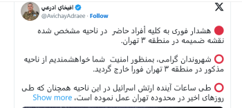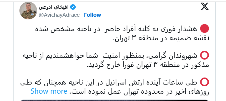 Армия обороны Израиля выпустила официальное предупреждение об эвакуации жителей отдельных районов Тегерана накануне ожидаемых ударов. Сообщение распространил пресс-секретарь армии на арабском языке Авихай Адраи. Он призвал мирных жителей покинуть указанные зоны ради собственной безопасности.